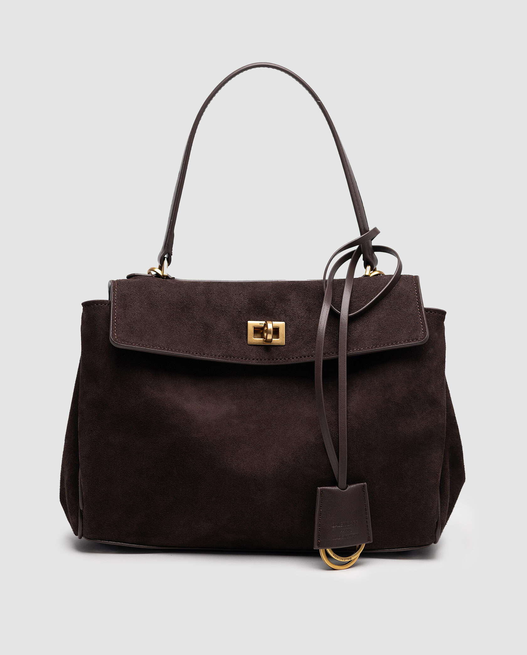 Розмір 28х19х9смСумка виконана в комбінаціі замші та гладкої шкіри.Всередині два відділення, також є кишеня на застібці.Більш вмісткою сумку можна зробити відстібнувши заклепки по боках.Підкладка з гладкої шкіри.Фурнітура металева, брендована.Зачиняється на фірмовому механізмі.Ремінець для носіння через плече виконаний зі шкіри, фіксованої довжини.Комплектується в брендовій коробці на магнітах та пильовику, є буклети та пакет.