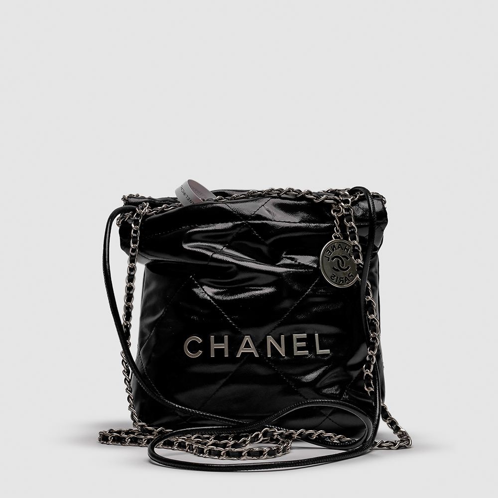 Розмір 23х22х6смСумка виготовлена з лакованої гладкої шкіри з простроченням.Всередині одне велике відділення, також є кишеня з маркуванням.Підкладка з щільного текстилю з ромбоподібним простроченням.Зачиняється завдяки стягування ланцюжка.Для носіння у руці та через плече є ланцюжок з вплетеною шкірою.Комплектується в брендовій коробці та пильовику, також в комплекті є картка, буклети та подарункова стрічка.