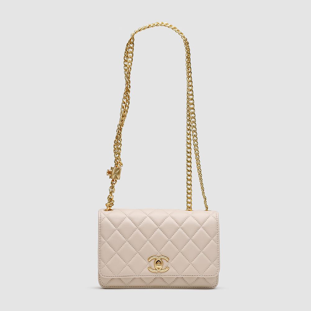Розмір 19х12.5х5смСумка виготовлена з гладкої шкіри з ромбоподібною прострочкою.Всередині одне відділення, також є дві кишені на застібках та відділи для карток.Підкладка з приємного на дотик текстилю та шкіри.Зачиняється відділення завдяки фірмовому механізму в логотипі.Ланцюжок для носіння у руці та через плече має можливість регулювання за довжиною.Комплектується в брендовій коробці на магнітах та пильовику, також в комплекті є картка, стрічка та буклети.