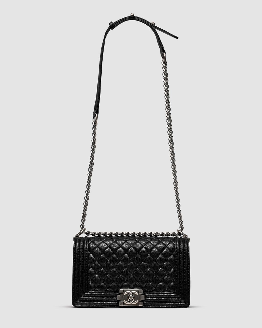 Розмір 24.5х14х8смСумка виготовлена з гладкої шкіри з ромбоподібною прострочкою.Всередині одне відділення, також є кишеня з брендуванням.Підкладка у сумки з щільного текстилю чорного кольору.Зачиняється сумка завдяки фірмовому замочку.Фурнітура металева, брендована.Золотистий ланцюжок має шкіряну ручку (є невеличкий діапазон регулювання)Регулюється як для носіння у руці, так і через плече.Комплектується в брендовій коробці та пильовику, також в комплекті є картка, буклети.