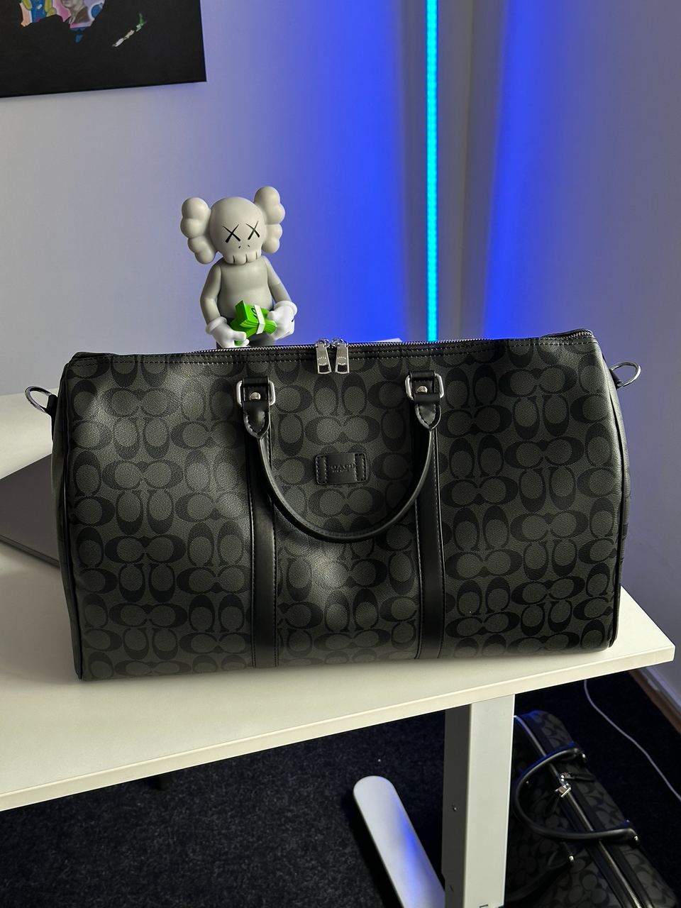 Розмір 50х28х23смСумка виготовлена з гладкої шкіри в фірмовій канві.Всередині одне велике відділення, також є кишеня на застібці, з фірмовим тисненням.Підкладка з щільного текстилю чорного кольору.Фурнітура дуже якісна, металева та брендована.Шкіряний ремінець на карабінах має можливість регулюватись по довжині.