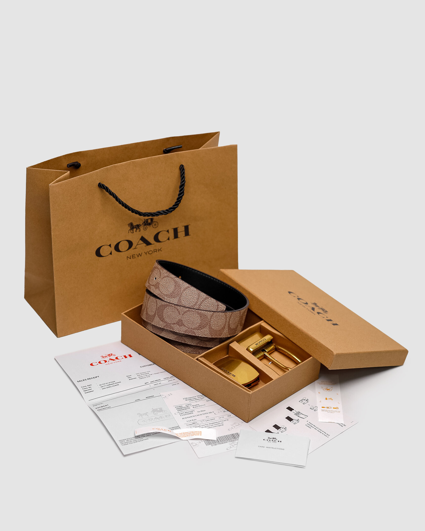 Розмір 125х3.5смРемінець виконаний з гладкої шкіри з фірмовою канвою.З однією сторони є можливість вкоротити довжину до необхідної довжини.В комплекті дві металеві бляхи з брендовими лого.Бляха закріплюється з необробленої сторони.Є можливість зробити додаткові отвори під необхідний розмір.Комплектується у брендовій коробці та пильовику, є пакет та буклети.