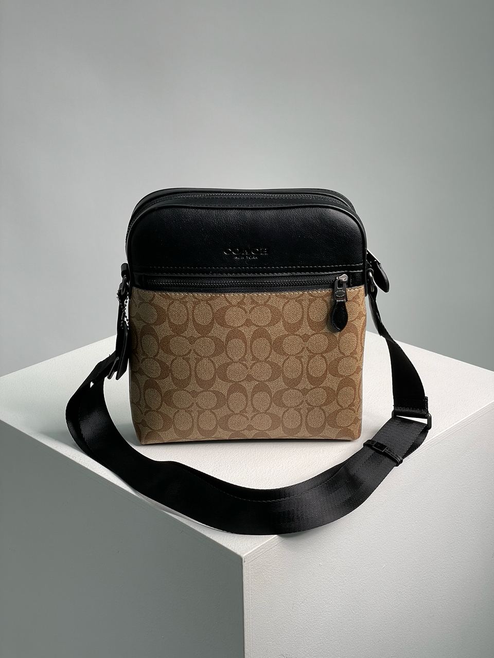 Розмір 23.5х26.5х5смСумка виготовлена з гладкої шкіри з фірмовою канвою.Всередині одне велике відділення, також є кишеня на застібці з шкіряною брендовою нашивкою.Підкладка з щільного брендового текстилю.Фурнітура якісна, металева та брендована.Ремінець з щільного текстилю чорного кольору, має регулюєму довжину.