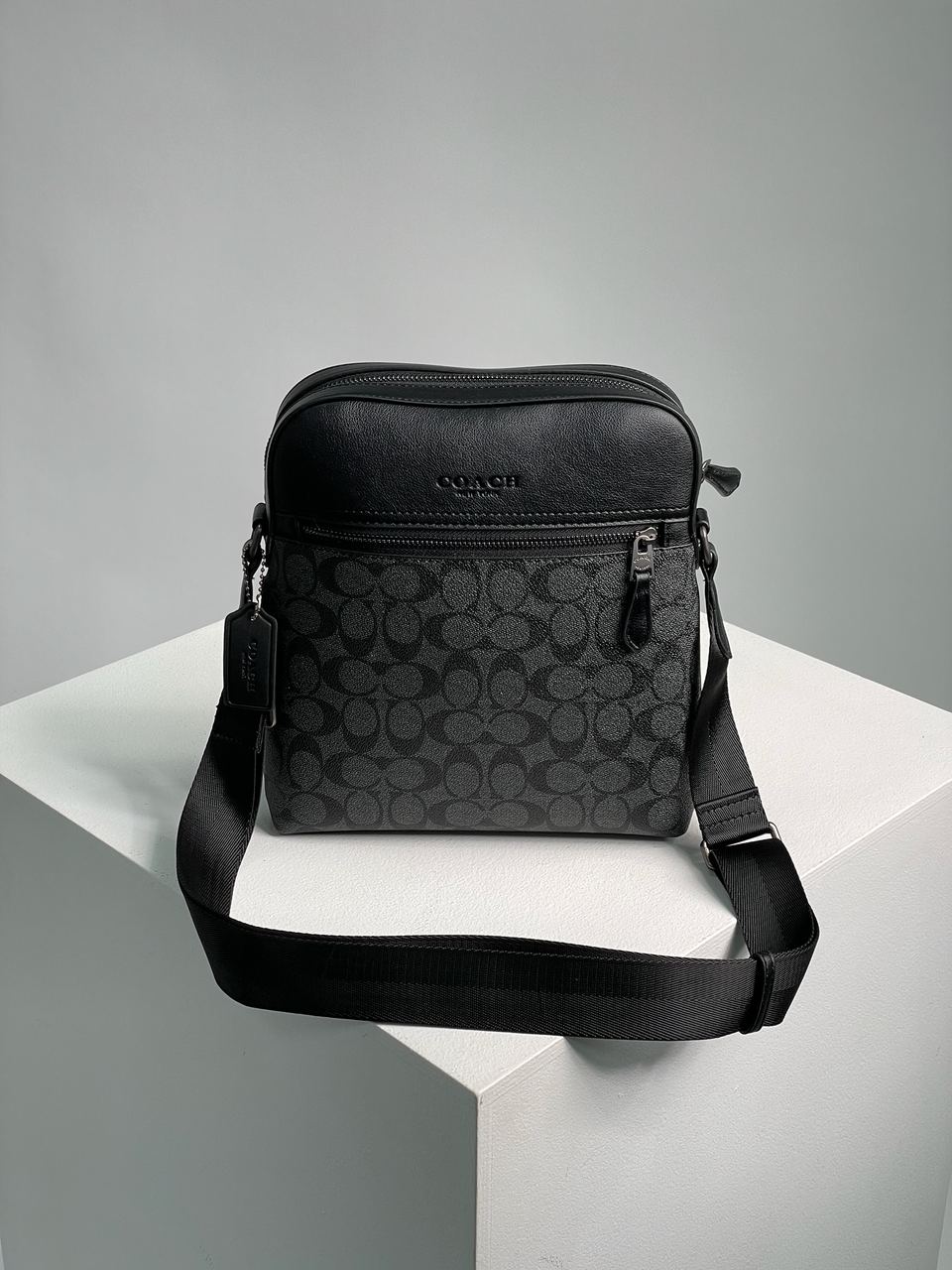 Розмір 23.5х26.5х5смСумка виготовлена з гладкої шкіри з фірмовою канвою.Всередині одне велике відділення, також є кишеня на застібці з шкіряною брендовою нашивкою.Підкладка з щільного брендового текстилю.Фурнітура якісна, металева та брендована.Ремінець з щільного текстилю чорного кольору, має регулюєму довжину.