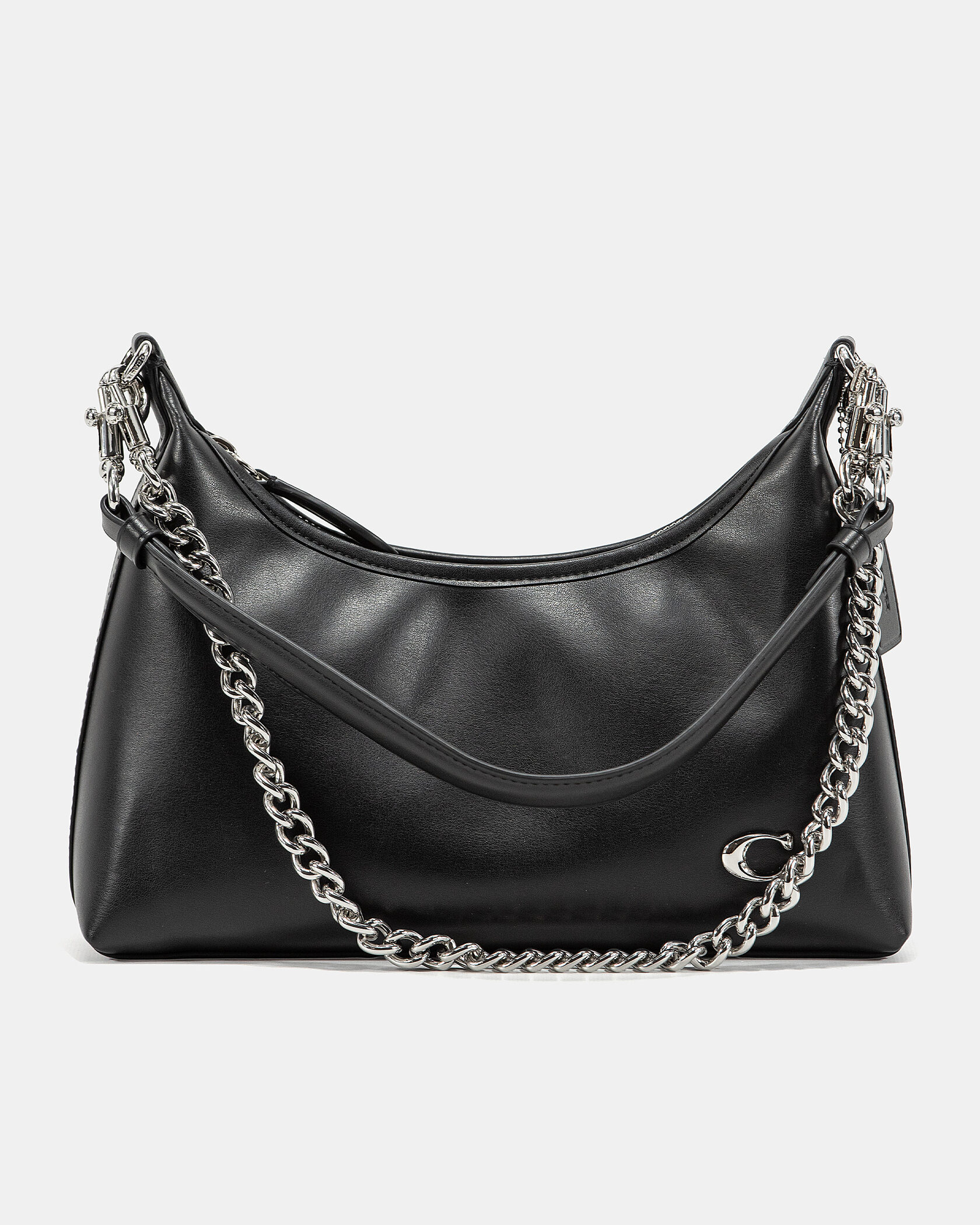 Розмір 27х20х9смМатеріал: Гладка екошкіра преміумФурнітура: СрібнаРучки: Регульований ремінь + знімний масивний ланцюгВідділення: Один основний простір із блискавкоюОсобливість: Елегантна форма півмісяця, мінімалізм і розкішна фурнітура — топ під джинси, тренч чи піджак