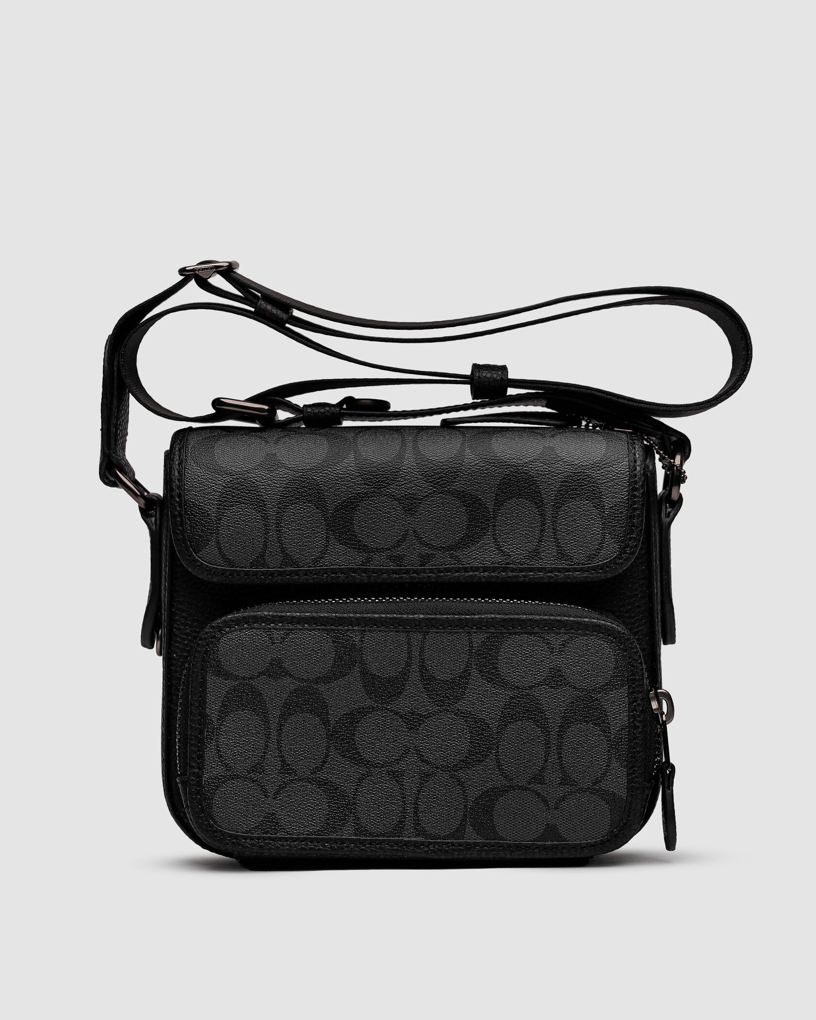 Розмір 21х18х7смСумка виконана з гладкої з фірмовою канвою.Всередині одне відділення, також є невеличка кишеня на застібці.Зачиняється відділення на магніті. Зовні на лицьовій стороні є кишеня на застібці.Підкладка з щільного та якісного текстилю гірчичного кольору, є шкіряна нашивка з брендовим тисненням та бірка.Фурнітура дуже якісна, металева та брендована.Ремінець з щільного текстилю чорного кольору, має регулюєму довжину.Комплектується в брендову коробку та пильовик.