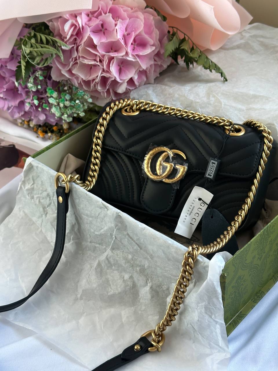 Розмір 22x13x6.5 смМатеріал: шкіраОдин відділ, маленька кишеняРемінець 90 смЛого всерединіВ комплекті: коробка Gucci , пакувальний папір, пильник фірмовий