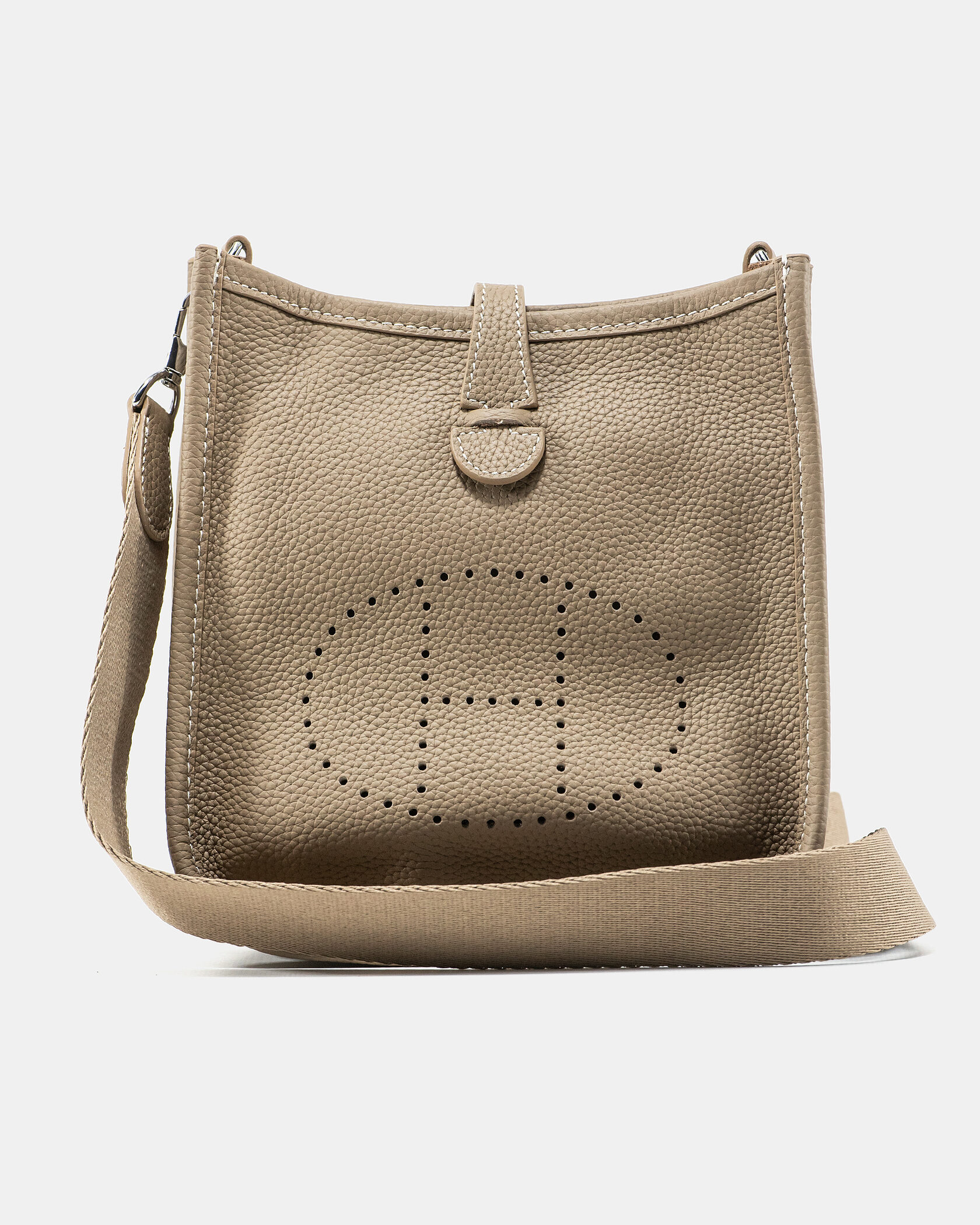 Розмір 18х19х6смМатеріал: Натуральна шкіраФурнітура: СрібнаРучки: Довгий регульований ремінець через плечеВідділення: Основне відкрите, з клапаном-застібкоюОсобливість: Компактна кросбоді Hermes Evelyne у нейтральному відтінку з фірмовою перфорацією “H”. Легка, зручна та універсальна для щоденного використання