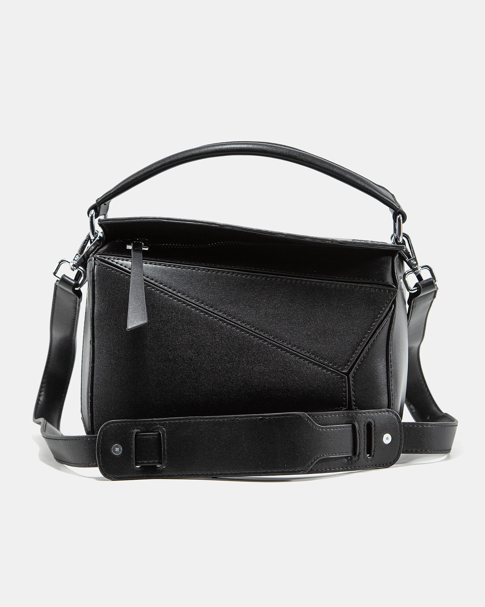 Розмір 23x15x10смМатеріал: Гладка екошкіра преміум якостіФурнітура: Срібна, мінімалістичнаКомплектація: Верхня ручка + широкий знімний ремінецьЗакриття: Блискавка + клапанВідділення: Одне основне, на підкладціСтиль: Геометричний дизайн Puzzle — впізнаваний силует Loewe. Ідеально підходить для міста й подорожей
