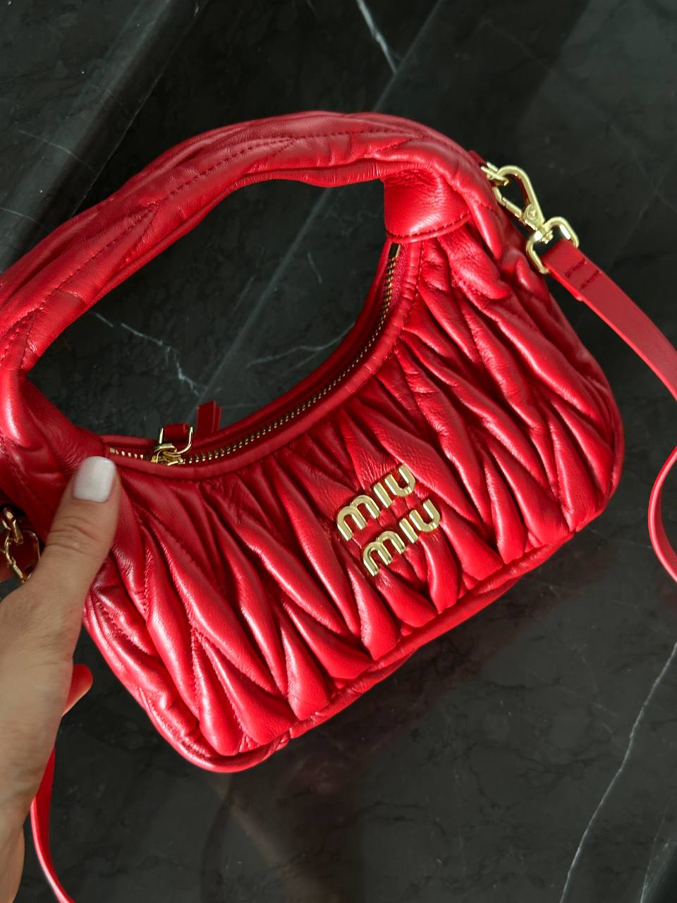 Розмір 21х23х7 смМатеріал: натуральна шкіраОдин відділ, маленька кишеняМеталеве лого всередині Довгий ремінець 95 см максимальна довжина (регулюється)В комплекті: оригінальна коробка miu miu, пакувальний папір, пильник фірмовий
