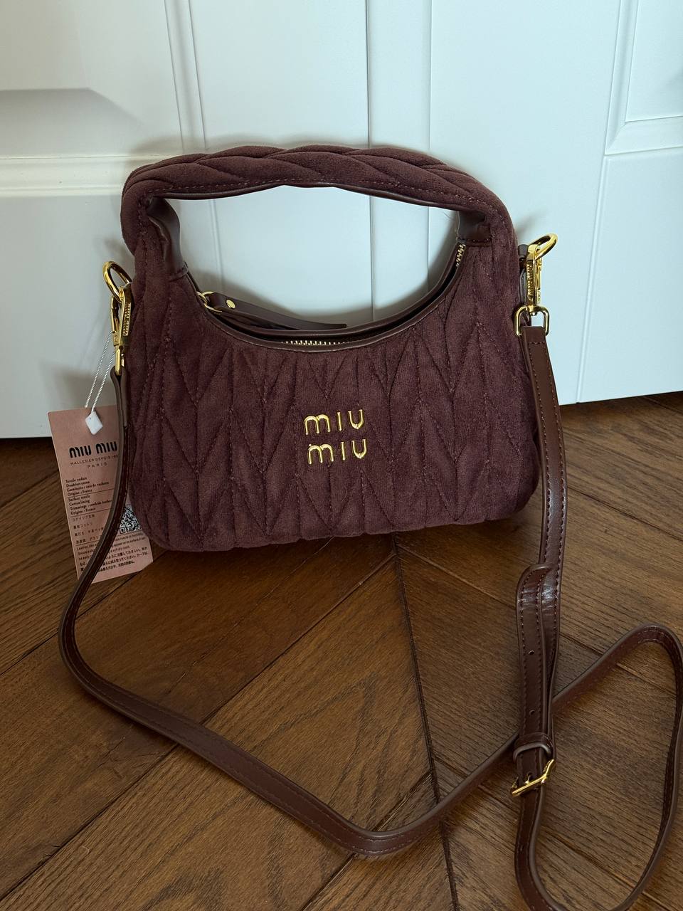 Розмір 21х23х7смМатеріал : замшаОдин відділ, маленька кишеняМеталеве лого всередині Довгий ремінець 95 см максимальна довжина (регулюється)В комплекті: коробка miu miu, пакувальний папір, пильник фірмовий