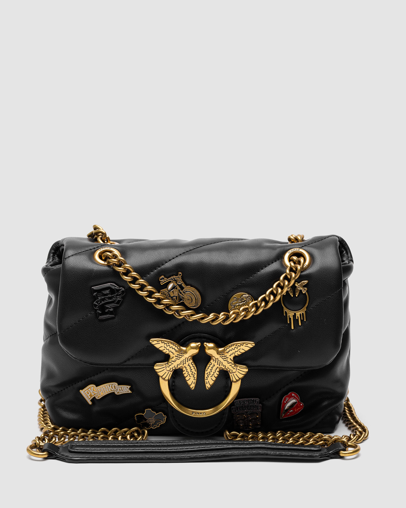 Розмір 22х15х9смСумка виготовлена з натуральної м’якої шкіри, прострочена.Попереду закріплено 8 металевих пінів.Всередині два відділення, поміж ними є кишеня на застібці.Підкладка у сумки з щільного приємного на дотик текстилю.Фурнітура металева, брендована.Ланцюжок золотистий, регулюється як для носіння у руці так і через плече.Ручка у ланцюжка прострочена, з натуральної шкіри.Комплектується у фірмовій коробці, пильовику, пакетику, також є невеликі буклетики.