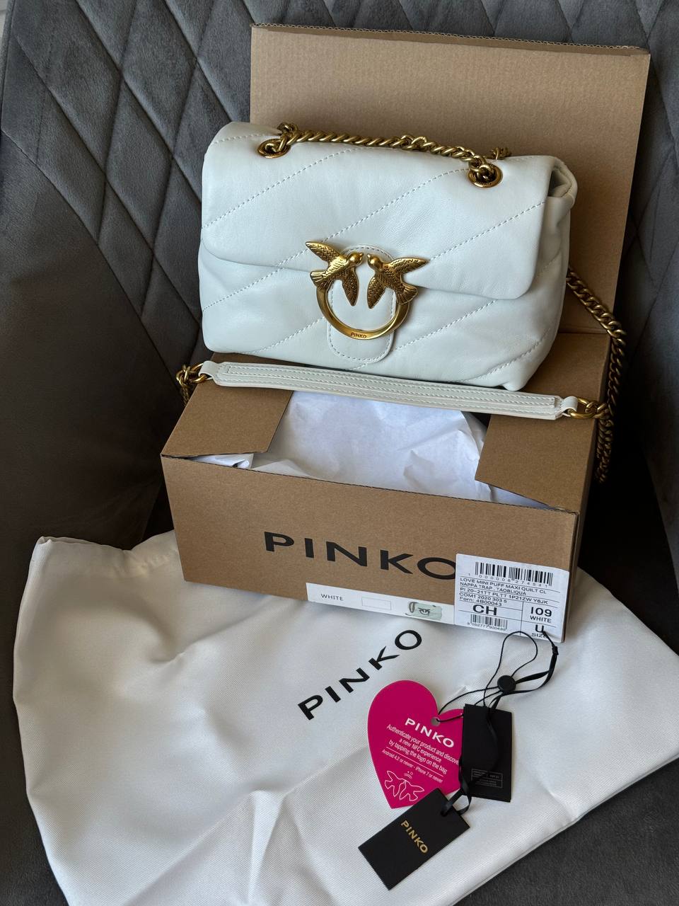 Розмір 21х12х7 смМатеріал: шкіраДва відділи, маленька кишеня, кишеня на блискавці Ремінець 90 смЛого всередині, сердечко з qr-кодом, бірочки В комплекті: коробка Pinko , пакувальний папір, пильник фірмовий,