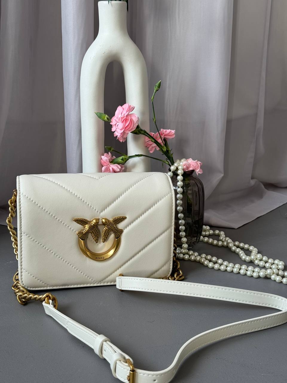 Розмір 17х12х8 смМатеріал: шкіраДва відділи, маленька кишеня, кишеня на блискавці Ремінець 90 смЛого всередині, сердечко з qr-кодом, бірочки В комплекті: коробка Pinko , пакувальний папір, пильник фірмовий