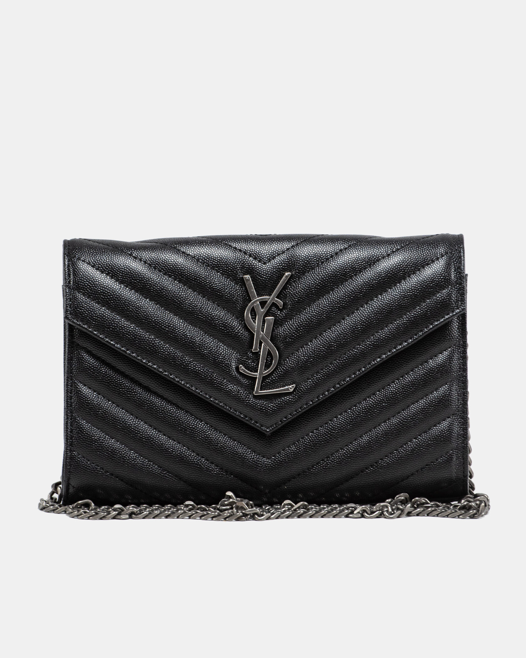 Розмір 23x15x5смМатеріал: ШкіраФурнітура: Чорнена металеваОсобливості: Компактна елегантна сумка-конверт із фірмовим логотипом YSL, стьобаним візерунком та ланцюжком. Створена для стильних образів на кожен день або вихід у місто.